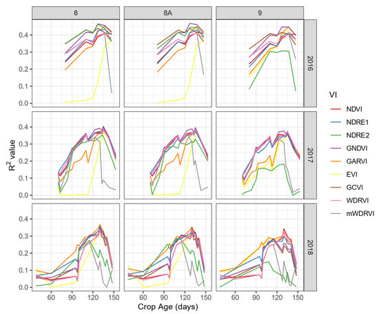 Nine vegetation indices (NDVI, NDRE1, NDRE2, GNDVI, GARVI, EVI, WDRVI, mWDRVI, and GCVI) derived from each Sentinel-2 image calculated with three different NIR bands (8, 8A, and 9) were correlated with the actual yield map of each year. In general, correlations based on bands 8 and 8A were higher than those based on band 9. Band 8 and 8A correlations had the same trend for all seasons and at all crop ages with slight differences. Band 9 has a spatial resolution of 60 m which provided only 57 pixels for the whole study field compared to band 8A and 8, which have a spatial resolution of 20 and 10 m and provided 516 and 2067 pixels, respectively. The higher spatial resolution could describe the field variability more accurately and improve the correlation results. Therefore, VIs based on band 8 were considered for further analysis.