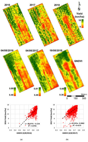 Measured yield maps (top) and Green Normalized Difference Vegetation Index (GNDVI) maps of date with a higher coefficient of determination for each year (middle) and corresponding scatter plot, equations, coefficient R2 values where p values < 0.001 (bottom (a) for 2016, (b) for 2017 and (c) for 2018 season).