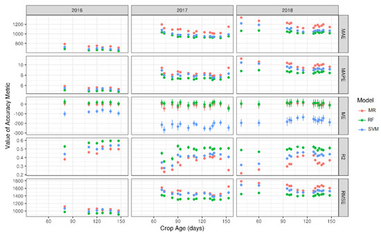 Figure 6 shows the result of the five calculated accuracy metrics, as reported in Equations (10)–(14). The mean absolute error (MAE) and the same as a percentage (MAPE) can distinguish how the best ML method ranges between 0.7 and 1.0 ton/ha, which corresponds to 5–8% of measured yields. Mean error is useful to assess bias; support vector machines ME values show that predicted yield values underestimated with respect to measured values. The whiskers in Figure 6 in the plot of the mean error show the variation of bias of each model when predictions were compared with measured yield values. This variation is +/− 0.05 ton/ha, which is minimal considering the 9 to 18 ton/ha range within-field zones. The correlation coefficient is reported for comparison reasons against the correlations found using the VIs reported in the previous section. Root mean square of errors is an important metric that is more sensitive than MAE to residuals of predicted and measured yield values.