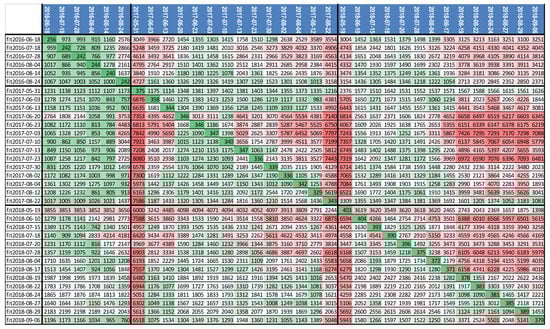 Another result pertaining to the application of machine learning models with Sentinel-2 reflectance timeseries data for crop yield prediction is depicted in Figure 7. Figure 7 reports on the accuracy of a model that was fitted by training with imagery from a certain date (rows), applied to imagery from all other dates (columns). The diagonal row in this table represents fitting and modelling on the same image and, as expected, provided the best performance. Other combinations show how well a model that is fitted on one image date performs on another image date. Figure 7 shows that the model must be used in the same conditions of crop growing stage to replicate acceptable accuracies. Machine learning methods are nonparametric methods and have many advantages, as mentioned here and in other studies, but are not easily interpreted and, therefore, replication of a model with imagery from other dates or different conditions is not advised.