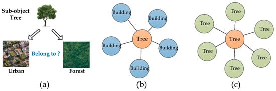 (a) An illustration of that one sub-object may belong to different objects, (b) the spatial relationship of a tree in the urban, (c) the spatial relationship of a tree in the forest.