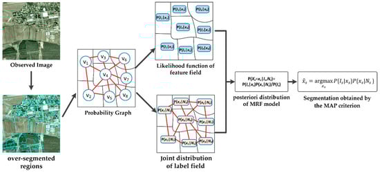 In the classic MRF model, the likelihood function of the feature field can only consider the pixel-based features, and the potential function of the label field can just model the spatial neighborhood interactions within a small spatial context, such as the 4-pixels or 8-pixels neighborhood. Hence, the classic MRF model has been extended to capture more complex structures within a larger neighborhood. In [], Bouman and Liu used the quad tree to represent the original image with the multi-resolution pyramid structure, and a lattice pixel at one resolution would correspond to four points at the next finer resolution. Then, a Gaussian autoregressive model was used to describe the image, and the segmentation result could be achieved by sequentially maximizing the posteriori probability of each resolution. In [], due to the nonredundant directional selectivity and discriminative nature of the wavelet representation, the wavelet transform was employed to provide the pyramid image decomposition, and the MRF model was defined over it. These multi-resolution MRF (MRMRF) methods can improve the classic MRF model by capturing image features and modeling the spatial context in a large neighborhood. But these methods are still pixel-based MRF methods, which are difficult to effectively describe the macro spatial interactions of the HSR images. Hence, the object-based MRF (OMRF) methods [,,,,] are studied in recent years. These OMRF methods use the over-segmented regions as the basic units of the MRF model, which can not only utilize the regional image features but also take macro spatial neighborhood interactions into account.