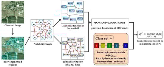 On comparing this equation with Equation (9) of the MAP criterion, we could see that this inference criterion brought two main advantages. One was that the EVPI term could capture not only the observed information and the spatial context with the posteriori probability but also the anisotropic interactions between various classes. The other was that the EVPI term could involve more posteriori information. In fact, the MAP criterion of the classic MRF only focuses on the class information that maximizes the posteriori probability , but the EVPI term would use all the class information of the posteriori probability for and integrate them with the corresponding anisotropic penalty. Hence, the inference criterion minimizing the EVPI provided a new feasible way to obtain the appropriate class of each vertex, and the segmentation result of the OMRF-AP model could be achieved by iteratively finding the optimal until convergence, i.e., . The flowchart of the OMRF-AP is shown in Figure 3.