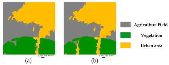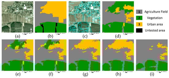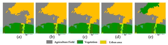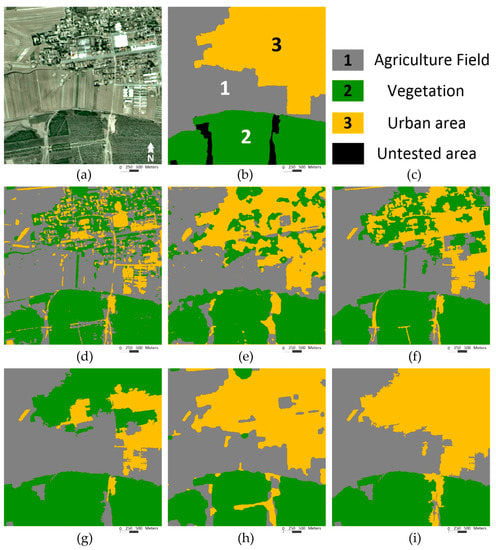 In the proposed OMRF-AP model, a heuristic setting approach was designed to set the APM. Namely, there were different , in the APM, and their initial values were set as the default value of Equation (13). Then, the result was evaluated by the confusion matrix [], and the term would be reset if the misclassification between class and had the maximum value during all the misclassifications in the confusion matrix. This process would continue until the accuracy rate of each class is higher than a given threshold. For instance, a SOPT5 image, located in Pingshuo, China, was tested with the threshold as 0.9 in Figure 4a. It included the agriculture field, vegetation, and urban area, which are denoted as class 1, 2, and 3, respectively. In this tested image, there were many vegetations in the urban area. Hence, these urban areas were wrongly recognized as the vegetation in the result with the default APM value, as shown in Figure 4d. According to the confusion matrix in Table 1, the accuracy rate of detecting an urban area was only 29.71% (<0.9), and the rate that urban areas misclassify as the vegetation was 51.21%, which had the maximum value during all the misclassifications.