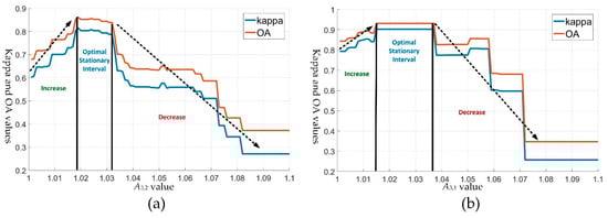 Kappa and OA (overall accuracy) values of different APM values. (a) Kappa and OA values of the OMRF-AP with different from 1 to 1.1 with step 0.001. (b) Kappa and OA values of the OMRF-AP with different from 1 to 1.1 with step 0.001 under the condition of .
