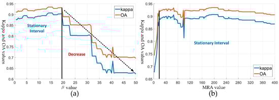 (a) Kappa and OA values of the OMRF-AP, with different values from 0 to 50, (b) Kappa and OA values of the OMRF-AP with different MRA (minimum region areas) values from 1 to 400.