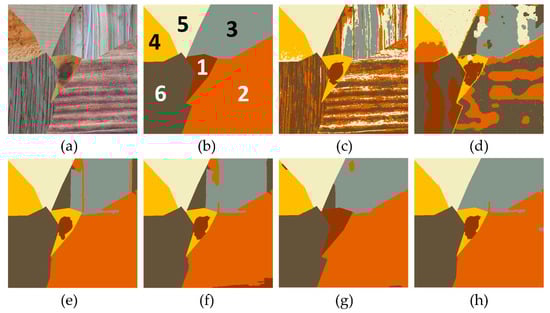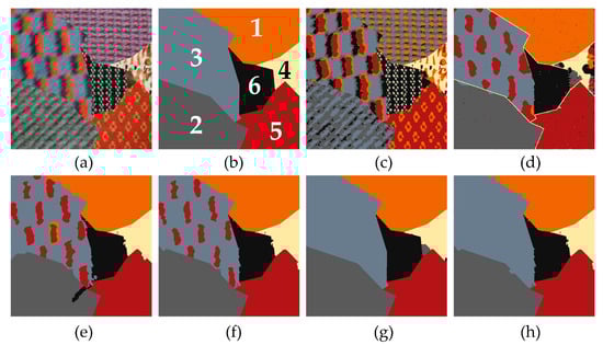 Segmentation results of six MRF-based methods for the second texture image. (a) Texture image (it is available as a Supplementary Material), (b) Ground truth with class number (each class number denotes one type of textures), (c) Result of ICM, (d) Result of MRMRF, (e) Result of IRGS, (f) Result of OMRF, (g) Result of NED-MRF, (h) Result of OMRF-AP.