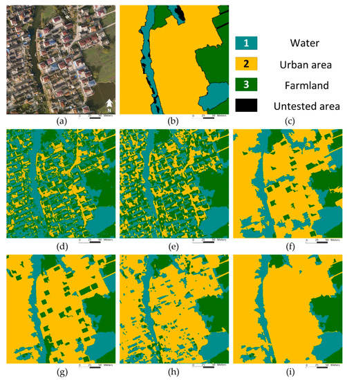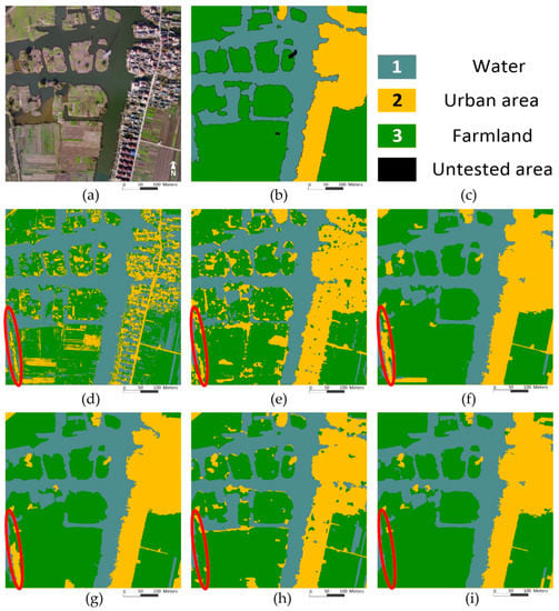 To further test the performance of the OMRF-AP against the VHSR image, another aerial image with 0.1 m spatial resolution was tested, as shown in Figure 12. It sized 2500 × 2500 and located in Taizhou, as well. There were water, urban areas, and farmland in this image. With the increasement of the spatial resolution, more detailed and diverse characteristics were demonstrated for each land class. Due to this, the results of the ICM and MRMRF had many misclassifications. By considering the over-segmented regions as the basic unit, the IRGS and OMRF extended the spatial neighborhood and provided more consistent results. But some misclassifications still existed, such as the buildings with red roofs in the urban area. With the training data, the NED-MRF could roughly distinguish three land classes. However, its pixel-based spatial energy function could not describe large spatial interactions effectively, which led to the wrong labeling of some shadow areas of the urban areas as the water. The OMRF-AP provided better performance than other methods by considering both the spatial interaction and class interaction in the object-based neighborhood. Namely, the long-term object-based spatial interactions helped the proposed method to get the rough segmentation, and the class interaction with APM could further correct some misclassifications by considering the relationship between specific land classes. The OMRF-AP also had the best quantitative indicators, as shown in Table 4.