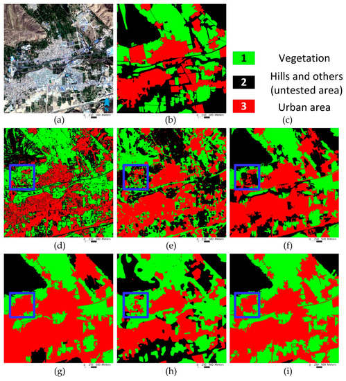 As the differences between urban areas and vegetations are quite vague and difficult to distinguish in some places, it makes the semantic segmentation more challenging. For instance, the results of the ICM, MRMRF, IRGS, and NED-MRF failed to recognize the district of urban areas marked with a blue square as their appearance was similar to the vegetation, as shown in Figure 13d–f,h. The OMRF wrongly labeled some vegetations as urban areas and had an over-recognition about the urban area at the marked region and other regions. By considering the class interaction, the OMRF-AP showed a better performance than other comparison methods. The quantitative indicators in Table 4 also validated the superiority of the proposed method.
