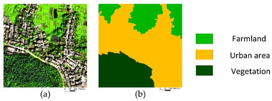 Image segmentation is one of the most important tasks in remote sensing image processing. Its purpose is to divide an image into some homogeneous regions. Specifically, semantic segmentation requires that each homogeneous region can represent one specific land object, such as urban, farmland, forest. Many approaches have been proposed for semantic segmentation in the last decades, including clustering methods [,,,], level set [,,], deep learning [,,,,], Markov random field model (MRF) [,,,,,,], etc. During them, some early approaches, such as clustering methods, usually assume that pixels belonging to the same object should have similar characteristics, and pixels between different objects would show different appearances. This assumption works well for the low or medium spatial resolution remote sensing images but fails to apply to the high spatial resolution (HSR) remote sensing image. In the HSR images, pixels in the same object would have various appearances, and some pixels of different objects could have similar characteristics. Moreover, more sub-objects can be recognized in the HSR image, and different objects may have the same sub-objects. For instance, as shown in Figure 1a, the sub-object, trees, may belong to the urban or the forest.