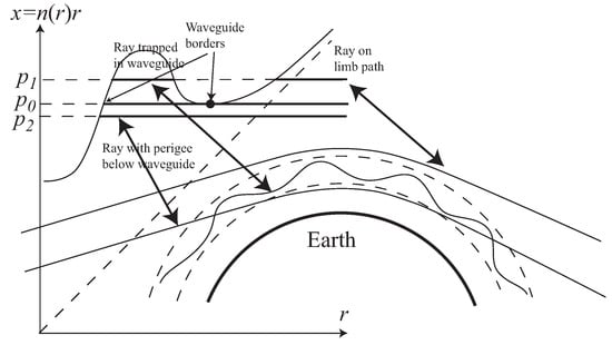 Because asymptotically for large height, decreases exponentially, and the refractive radius becomes close to the geometrical radius, we can point out that the situation with waveguides and super-refraction corresponds to non-monotonic profiles of . For each ray, by virtue of Equation (11), . This leads to the consideration of super-refraction illustrated in Figure 1. In some situations, to a single value of the impact parameter, multiple rays may correspond. However, only one of them can be observed from space, while the other rays are trapped by the waveguide.