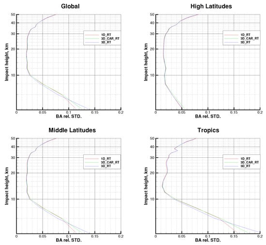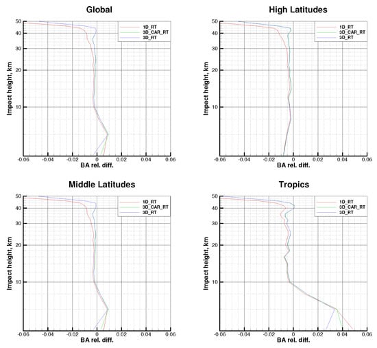 From the viewpoint of the computational expenses, 3D_CAR_RT approach is much cheaper than 3D_RT. This follows from the fact tha the highest computational expenses come from the evaluation of its derivatives with respect to the gridded fields of the model variables. Therefore, in 3D_RT, the evaluation of involves much more components of the atmospheric state vector , as compared to 3D_CAR_RT. On the other hand, 3D_RT approach can be limited to the lower troposphere and combined with another 1-D operator above a height of 7–10 km, where the influence of the horizontal gradients upon the standard retrieval based on the Abel inversion becomes weaker.