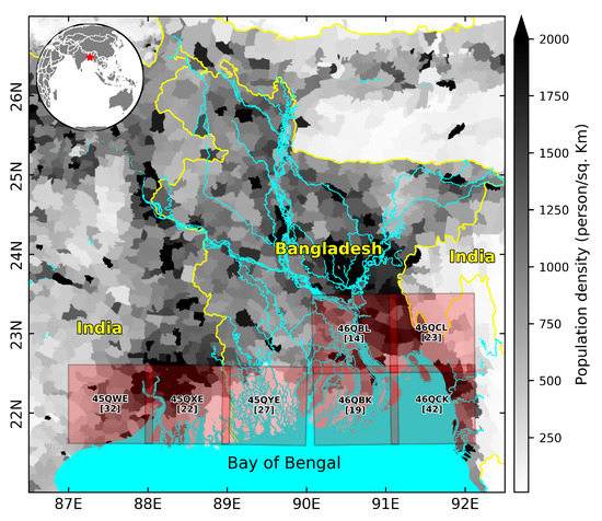 Location of the study area and the coverage of the Sentinel 2 tiles used in this study. Each tile (showed as a translucent red patch) is annotated with the tile identifier and in bracket the number of images used. The major rivers (showed in aqua color) is overlaid on the Gridded Population of the World (GPWv4) dataset (in grey scale) [32].