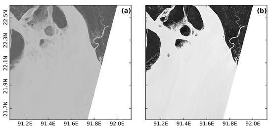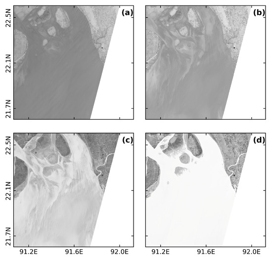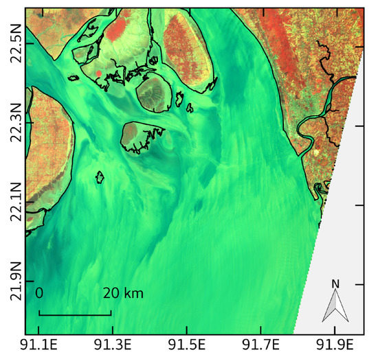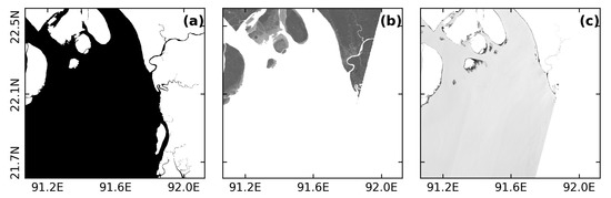 The Bengal coast is also characterized by erosion and accretion of the shoreline that manifests at various timescales ranging from days to decades [35]. These changes are particularly prominent in the mouth of Meghna estuary where the combined flow of Ganges, Brahmaputra, and Meghna is discharged. The large sediment discharge accompanies the runoff during the monsoon and then gets spread by far-reaching tidal currents as well as extreme events such as riverine floods and tropical cyclones [35,36]. Because of this dynamic nature, it is not feasible to perform repeated, extensive in situ hydrographic surveys over this extended deltaic region, thus making it a very interesting test case for applying our methodology.
