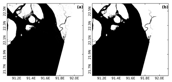 (a) Binary water (BW) image obtained from the combination of and for tile #46QCK acquired on 01/02/2017 04:38:25. (b) Same as (a) after applying filling of water pixel group smaller than 10,000 pixels and removing land pixel groups smaller 10,000 pixels.