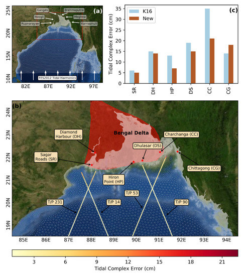The tidal analysis on the unstructured grid is performed using COMODO tools developed at LEGOS [48] on simulated hourly water level from December 2013 to January 2015 (14 months). In total, 33 constituents (M2, S2, O1, K1, K2, L2, J1, E2, 2N2, La2, M3, M4, M6, M8, Mf, MKS2, Mm, MN4, MS4, MSf, Mtm, Mu2, N2, N4, Nu2, P1, Q1, R2, S1, S2, S4, T2, Sa, Ssa), as well as the long-term mean (Z0) is extracted. This essentially amounts to a new tidal atlas for the northern Bay of Bengal. The quality of the tide is assessed using complex error calculated from four dominant tidal constituents—M2, S2, O1, and K1. The assessment is carried out based on two independent datasets: tidal constants obtained from in situ tide gauges, and from spaceborne altimetry. The latter dataset is the CTOH product, available on http://ctoh.legos.obs-mip.fr/data/coastal-products/coastal-products-1/tidal-constants (see this website for further details on the altimetric processing). Our tidal atlas appears globally consistent with the spaceborne product, with errors in the offshore domain of order 3 cm, increasing shoreward along all altimetric tracks, but nowhere exceeding 23 cm. Figure 9c shows the complex error estimation for the tide gauges shown in Figure 9b and its comparison with the results in [29]. At the gauge stations we have found a substantially reduced error estimate, particularly at the central region stations of Charchanga (CC) and Hiron Point (HP). The overall accuracy of our tidal atlas is of order 5 cm to 20 cm, which is unprecedented over our region, and in line with the performance of state-of-the-art tidal atlases along the best-documented shorelines [49].