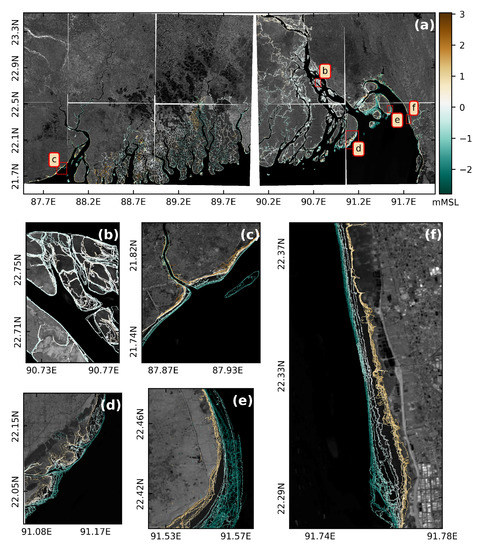 Figure 10a presents our DEM over the whole domain overlaid on merged B11 band used in this study. Our DEM maps 1134 km intertidal area along the coast of Bengal delta at 10 m resolution. The horizontal extent of our DEM is in order of 600,000 km. The mapped intertidal topography ranges from m to 3 m with respect to MSL. To the best of our knowledge, the geographical coverage of our product, along with the level of details visible at fine scale throughout the deltaic river network, is unprecedented over our area. Figure 10b–f provides close-up views of several key-locations of the delta, contrasting the eastern active side of the delta (Meghna estuary, Figure 10b), the western dead side of the delta (Hooghly estuary, Figure 10c), the muddy islands located in the immediate vicinity of the mouth of Meghna (Hatiya Island, Figure 10d and Sandwip Island, Figure 10e), and the sandy beach region of Chittagong analyzed by [27] (Figure 10f).