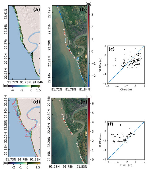 Beyond the qualitative—though reassuring—features discussed above, it is timely to carry out a quantitative assessment of our DEM against independent in situ observations. We did so by relying on the three nautical charts from Bangladesh Navy Hydrographic and Oceanographic Centre (chart #1251, #3001, and #3509, based on surveys conducted in 2012–2015). We considered all charts point-wise soundings falling in the intertidal area, and co-located them with our own DEM. This resulted in 145 comparison points, displayed in Figure 11a. Figure 11b shows the error at individual points. For further visual comparison, a scatter plot between our DEM vs the in situ chart observations are shown in Figure 11c. The root-mean square difference between our DEM and the in situ soundings is close to 1.5 m, which is similar to [27]. However, our DEM presents a deep bias with the in situ soundings of 0.36 m. This value has the same sign, but is much smaller than the 1.2 m bias observed by [27]. This value is also in line with the typical bias of similar approaches in other regions [5].