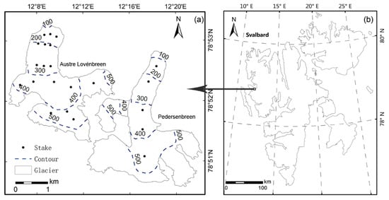 Svalbard (74°N–81°N; 10°E–35°E) is covered by a large number of small glaciers and ice caps, which compose 60% of the archipelago []. The total glaciated area on Svalbard is 34,560 km2, which is approximately 6% of the worldwide glacier cover, except for Greenland and Antarctica []. Most glaciers in Svalbard are polythermal glaciers, which are sensitive to climate changes; therefore, it is important for scientists to monitor and study the glaciers of Svalbard. Many scientists, especially Norwegian scientists, have performed studies on the glaciers in Svalbard. The glaciers Kongsvegen and Kronebreen have been widely studied for a significant amount of time []. Since the Chinese Arctic Yellow River Station was built in 2004, Chinese researchers have focused on Arctic glaciers, carrying out long-term studies on Austre Lovénbreen and Pedersenbreen in Svalbard []. Chinese researchers have investigated the volume of Austre Lovénbreen and Pedersenbreen [] and estimated the mass loss of Pedersenbreen during the periods from 1936 to 1990 and from 1990 to 2009 []. The velocities of the two glaciers have also been studied, and the latest research has discussed the fastest ice flow region of Austre Lovénbreen by combining modeling methods with in situ surveying methods [].