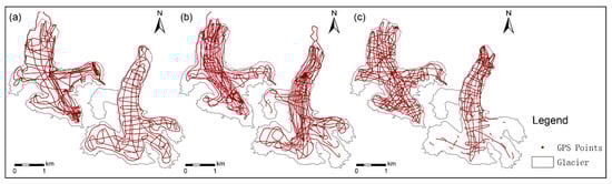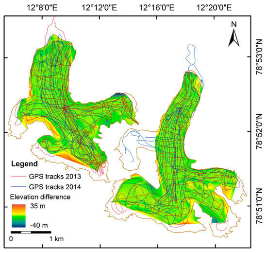 The 20-stake observation network on Austre Lovénbreen and five observation stakes along the central line of Pedersenbreen were placed in July 2005 []. The movement of these stakes has been annually monitored with high-precision GPS instruments for glacial movement and mass balance studies []. In April 2013, April 2014, and May 2015, high-density RTK-GPS points on the surface of Austre Lovénbreen and Pedersenbreen were collected via a snowmobile carrying GPS equipment, and the GPS tracks are shown in Figure 2. The base station is located at the Yellow River Station in Ny-Ålesund. The main purpose of this survey was to map the surface digital elevation model (DEM) and to estimate surface changes. The height data from the GPS measurements were ellipsoidal heights, which needed to be converted into altitudes above sea level. An elevation benchmark near the glaciers (<10 km) was set in Ny-Ålesund. According to a previous study [], the geoidal height at this point was calculated as 35.158 m, which was used to convert the measured GPS heights to altitudes above sea level. Because we used the relative change of elevations in this study, the tectonic movement at Ny-Ålesund was neglected, since the two glaciers move together with the earth’s crust motions.