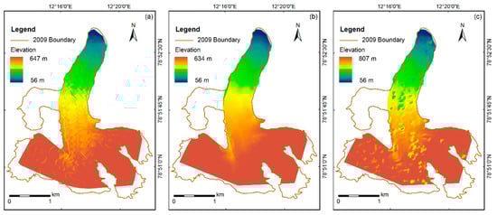 DEMs (digital elevation models) of Pedersenbreen in 2013 generated from different interpolation methods: (a) OK (ordinary kriging), (b) NN (natural neighbor) interpolation, and (c) spline interpolation.