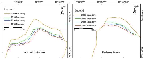 Glacier boundaries of (a) Austre Lovénbreen and (b) Pedersenbreen.