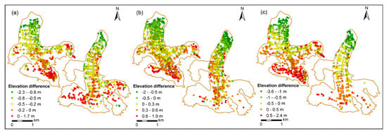 Elevation differences in the crossover points of the RTK-GPS (real-time kinematic global positioning system) tracks from different years: (a) 2013–2014, (b) 2014–2015, and (c) 2013–2015.