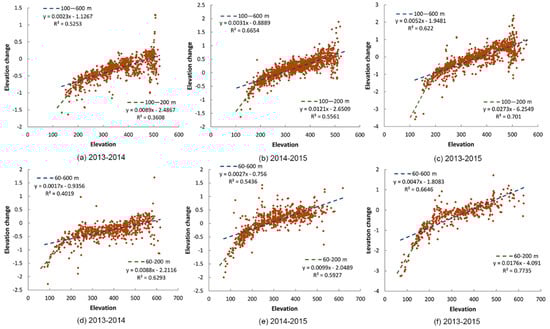 To illustrate the relationship between elevation changes and the surface elevation more directly, scatterplots are shown in Figure 9. There appeared to be a significant correlation between the elevation and the elevation change in 2013–2015. In general, both glaciers showed that the correlation was slightly lower in one-year intervals than in a two-year interval. The correlation at the glacier snout differed from the correlation for the entire glacier area; the ice melted more dramatically in the glacier snouts at elevations between 100 m and 200 m, according to the elevation change trend. According to Figure 9, the mass loss trend of Austre Lovénbreen was more dramatic than that of Pedersenbreen. This finding was consistent with the mass balance results in Table 6.