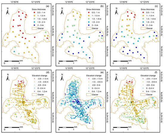 Snow depth data of Austre Lovénbreen were obtained from the French team for validation and comparison over the same period (during 2013–2015). The snow depth distributions of Austre Lovénbreen (Figure 10a–c) demonstrated that the snow depth logically increased from north to south, with shallower snow depths at lower elevations and more snow accumulation at higher elevations, representing a positive relationship between snow depth and elevation. According to Figure 10d–f, more snow remained because of glacial accumulation in 2014 than in the other two years combined. In addition, Austre Lovénbreen experienced similar snow accumulation at relatively low elevations in 2013 and 2015, even though 2013 was shallower; in contrast, in the upper cirques of the glacier, there was clearly a deeper snow depth in 2015 than in the two other years. This situation was in accordance with the analyses we performed with RTK-GPS data; hence, we believed that the main difference between 2014 and 2015 was that the snow at relatively high elevations in 2014 did not melt completely during the melting season. In contrast, very little snow survived the summer of 2013, and little or no accumulation was observed. To accurately calculate the mass balance of Austre Lovénbreen, the interpolated snow depths in three years measured by snow cores were removed from the crossover points of the RTK-GPS tracks. Then, ice-surface elevation changes were calculated, as shown in Figure 10d–f. In conjunction with snow depth, the ice changes and snow changes were calculated separately.