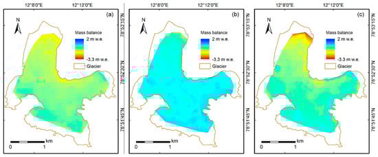 Mass balances calculated considering the snow depth of Austre Lovénbreen in (a) 2013–2014, (b) 2014–2015, and (c) 2013–2015.