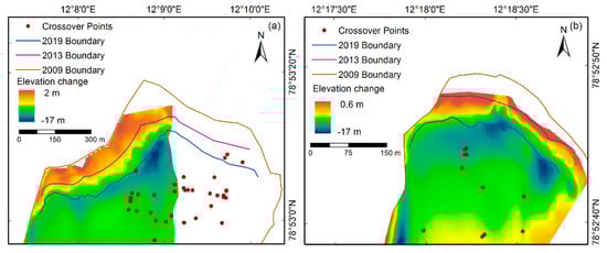 Elevation changes for the glacier snouts of (a) Austre Lovénbreen and (b) Pedersenbreen from 2013 to 2019. The 2019 boundaries of two glaciers were extracted from UAV (unmanned aerial vehicle) images. The crossover points were extracted from RTK-GPS (real-time kinematic global positioning system) tracks between 2013 and 2015.