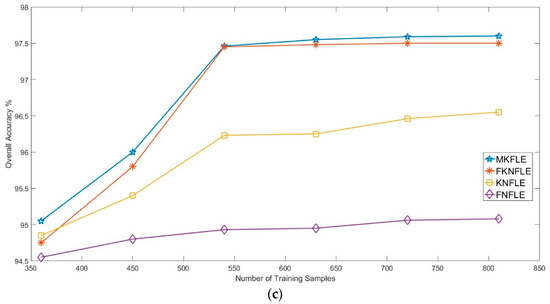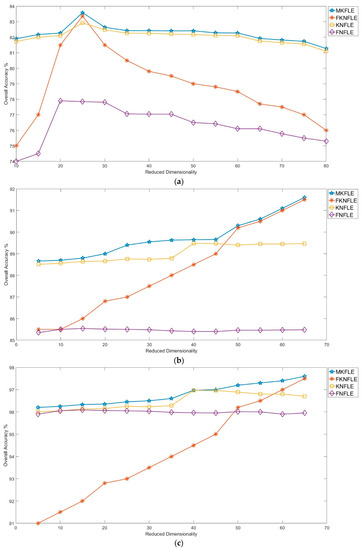 The proposed MKFLE algorithm was compared with three state-of-the-art schemes, i.e., KNFLE, FNFLE, and FKNFLE [25]. The training samples were chosen randomly for computation of the transformation matrix, and the testing samples were applied to the nearest neighbor (NN) matching rule to matched with the training samples. The obtained average rates for each algorithm were run 30 times. In order to extract the suitable reduced dimensions of MKFLE, the obtained training samples were applied to measure the reduced dimensions versus the overall accuracy (OA) in the experimental datasets. As demonstration in Figure 2, the proposed MKFLE for datasets IPS-10, Pavia University, and Pavia City Center has the most suitable dimensions in 25, 65, and 65, respectively. From the classification results as shown in Figure 2, the proposed MKFLE outperforms all the other algorithms at the specific reduced dimensions on three datasets and with lower variant OA rates than the single kernel-based FKNFLE algorithm, which demonstrates the effectiveness of the proposed MKFLE. Based on observing Figure 2, a simple analysis was also done. When only fuzzy or single kernel method was applied in FLE, such as FNFLE and KNFLE, both of them obtained lower variant OA rates, and the kernel method was much more helpful than the fuzzy method since KNFLE outperformed FNFLE. Although FKNFLE outperformed the FNFLE and KNFLE, the variant OA of FKNFLE is large. Since the FKNFLE combined two different types of nonlinear and non-Euclidean information, it might cause the higher variant OA rates. In the meanwhile, multiple kernels applied in the proposed MKFLE used only nonlinear information with various parameters, which could improve the performance and obtain lower variant OA rates. In addition, since the MKL strategy was applied in the MKFLE training phases, which embedded different views of manifold structures from multiple kernel feature space, the reduced space obtained by the proposed MKFLE could be more general than FKNFLE, and obtained lower variant OA rates. From this analysis, the proposed MKFLE is much more superior than the FKNFLE, KNFLE, and FNFLE in HSI classification.