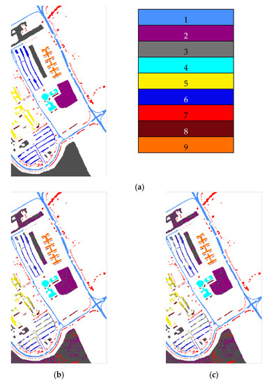 The other two data sets, Pavia University, and Pavia City Center, were both the scenes covering the City of Pavia, Italy, obtained from the Reflective Optics System Imaging Spectrometer (ROSIS). They have 103 and 102 data bands, both with a spatial resolution of 1.3 m and a spectral coverage from 0.43 to 0.86 um. The dimension of these two images were 610 × 340 and 1096 × 715 pixels, respectively. The false color IR image of these two image were illustrated as Figure 1b,c. There were nine land-cover classes in each data set, and in each data set, the samples were divided into training and testing part, respectively. For example, in the Pavia University data set, there were 90 training samples in each class selected randomly for training, and the remaining 8046 samples were used for testing the performance. Based on the same manner, there were 810 training and 9529 testing samples used for the Pavia City Center data set, respectively.