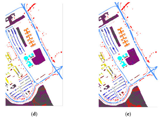 The classification results maps on Pavia University dataset applying various algorithms: (a) The ground truth; (b) MKFLE; (c) FKNFLE; (d) KNFLE; (e) FNFLE.