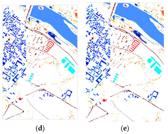The maps of classification results on Pavia City Center dataset applying various algorithms: (a) the ground truth, (b) MKFLE; (c) FKNFLE; (d) KNFLE; (e) FNFLE.