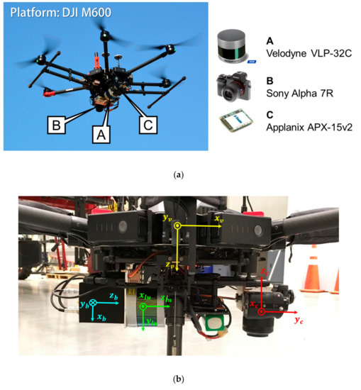 The Unmanned Aerial Vehicle (UAV)-based mobile mapping system used in this study: (a) the sensors mounted on the UAV, and (b) the orientation of the vehicle frame (yellow), Global Navigation Satellite System/Inertial Navigation System (GNSS/INS) body frame (cyan), laser unit frame (green), and camera frame (red) coordinate systems.
