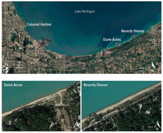 The Great Lakes are experiencing high water levels after a 15-year period of low water levels. With the persistently high water level, storms have much more potential to erode shorelines. Communities have reported erosion that threatens beaches, buildings, and coastal infrastructures. The field surveys took place at two sandy beaches along the Indiana shoreline of Lake Michigan, USA. Both the beaches are small, private residential communities located in the towns of Dune Acres and Beverly Shores. Figure 3 shows the locations and the survey area within the two sites. The length of the beach surveyed is 450 m and 340 m for Dune Acres and Beverly Shores, respectively. Calumet Harbor water level gauge data provided by NOAA (station ID 9087044) [46] was used in this study for determining the water level at the time of the UAV surveys. This is the nearest station to the study sites, and its location is also shown in Figure 3.