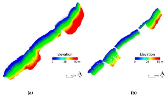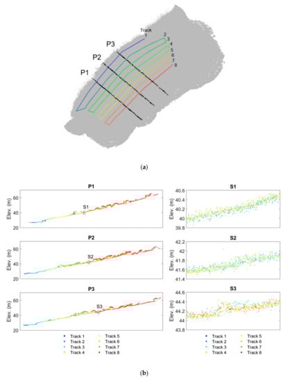 The quality assessment of the LiDAR point cloud is based on across flight line profiles. Fight mission 1 in Dana Island is used to investigate the alignment of the point cloud between different tracks (i.e., flight lines). This flight mission contains eight flight lines, as shown in Figure 6a, with a flying height of 40–50 m above ground. The lateral distance between flight lines is approximately 15 m, which results in approximately 85% sidelap between adjacent strips considering the ±70˚ off-nadir scan angle used for reconstruction.
