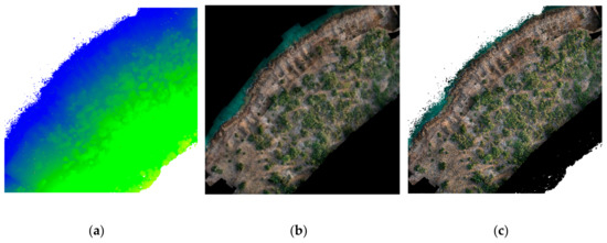 Spatial products from mission 1 of the Dana Island survey: (a) LiDAR-based DSM, (b) orthophoto, and (c) color-coded DSM.