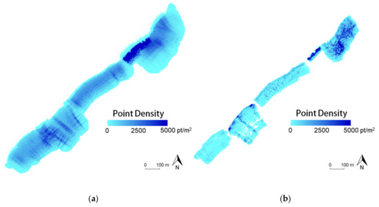 Point density maps for: (a) LiDAR point cloud, and (b) image-based point cloud.
