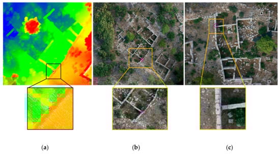 Prior to investigating the alignment between LiDAR and image-based profiles, which is essentially a 3D to 3D comparison, we inspected the point cloud to image geo-referencing as a 2D to 3D qualitative quality control. As mentioned earlier, the data acquired by the LiDAR unit and camera are georeferenced to a common mapping frame defined by the GNSS/INS trajectory and the mounting parameters estimated through the system calibration procedure. The integration of data derived from different sensors is not only a key strength of the used mobile mapping system but provides a way for assessing the quality of the GNSS/INS trajectory and system calibration parameters. Given a point in the point cloud, we can locate it on the orthophoto, and more importantly, backproject it onto the images that captured the point. The quality of backprojection would indicate the accuracy level of the system calibration together with the GNSS/INS trajectory. Figure 8 shows the qualitative quality control result in an area with some ruins in the Dana Island. Here, an intersection of walls is selected in the LiDAR point cloud, shown in the orthophoto, and backprojected onto the image which captured the point from the closest position. The correct location of the resultant 2D point on the orthophoto and from backprojection validates the quality of the GNSS/INS trajectory, as well as the mounting parameters from system calibration. The registration quality also validates the accuracy of the estimated IOPs of the camera.