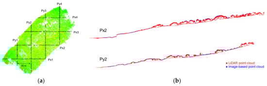 Profiles along the X and Y directions (referenced to the mapping frame) were extracted every 50 meters to evaluate the horizontal and vertical alignment between LiDAR and image-based point clouds. Figure 9a depicts the profile locations for flight mission 1, where Px1Px4 are profiles along X direction, and Py1Py4 are profiles along the Y direction. Figure 9b displays the side view of profiles Px2 and Py2. Table 3 lists the shift and rotation between the LiDAR and image-based profiles for all flight missions (using image-based profiles as reference), where Px1Px22 are profiles along the X direction, and Py1Py22 are profiles along the Y direction. Despite the considerable difference in spatial coverage and point density, the profiles illustrate good alignment between LiDAR and image-based point clouds. The overall discrepancy along the X and Y direction are 0.2 cm and 0.1 cm, respectively. A larger but still acceptable discrepancy is observed along the Z direction, where the shift ranges from 8.9 cm to 8.6 cm, with an average of 0.2 cm. The rotations around the X and Y axes are 0.0051 degrees and 0.0050 degrees, respectively, which can be transformed to a 0.4 cm shift at a distance of 50 m. Examples of the profiles displayed in Figure 9b further demonstrate the potential of UAV LiDAR in mapping coastal environments. Compared to the image-based point cloud, the LiDAR point cloud is significantly denser and captures more details of the terrain. While the image-based approach can only reconstruct points on the visible surface, the LiDAR shows an ability to penetrate the vegetation and capture points below the canopy, which facilitates reliable digital terrain model (DTM) generation.