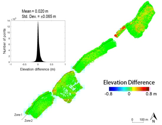 Elevation differences () can be obtained by performing spatial subtraction of the DSMs using Equation (4), where and are the elevations at location for two successive surveys.