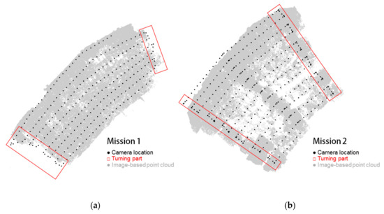 Camera locations in mission 1 and mission 2 while showing the impact of UAV-flight setting while making a turn: (a) smooth turn while maintaining speed, and (b) stop and turn approach (refer to the red boxes).