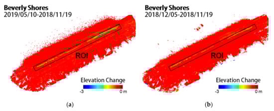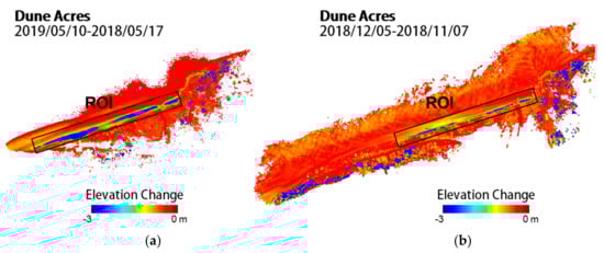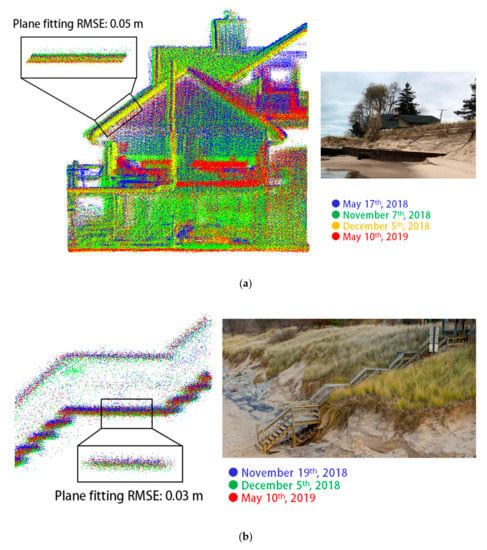 Prior to quantifying shoreline change, we first assess the agreement between the LiDAR datasets collected at different dates by manually picking and extracting a portion of point cloud capturing a structure (building, street light, etc.), which presumably remained stationary between subsequent data collections, and checked the alignment across multiple dates. Figure 12a shows point cloud alignment over a building at Dune Acres between 17 May 2018, 7 November 2018, 5 December 2018, and 10 May 2019. We performed plane fitting over a planar segment on the roof for the combined dataset. The root-mean-square error (RMSE) of the normal distances of the roof points from the best-fitting plane is 0.05 m, indicating that all datasets are in agreement within a 0.05 m range. Figure 12b shows point cloud alignment over a wooden stair at Beverly Shores as captured on 19 November 2018, 5 December 2018, and 10 May 2019. The plane fitting RMSE over a planar segment on the wooden stair for the combined dataset is 0.03 m, suggesting that the three datasets are compatible within a 0.03 m range. These results show that the point clouds collected at different dates are consistent in elevation. Moreover, these reported RMSE values support our prediction that the precision of the derived point cloud is ±0.10 m.