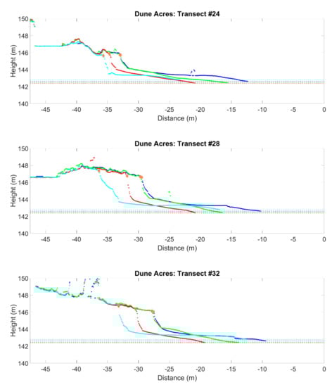 Cross-shore transects at Dune Acres showing transect #24, transect #28, transect #32, and transect #40 (the IDs are corresponding to those shown in Figure 13).