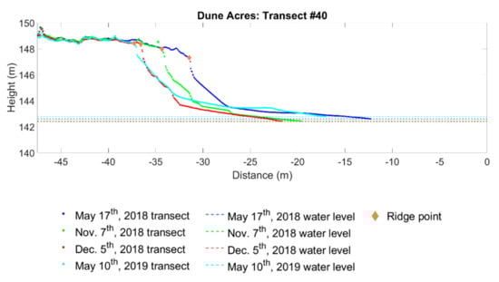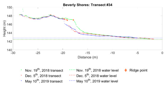 Cross-shore transects are a traditional metric of shoreline change in coastal engineering. The transects resolve the elevations along lines perpendicular to the coast, providing a cross-sectional view of shoreline change. These transects can be easily extracted from the DSM. In this study, we used the water level gauge measurement to determine the limit of the transects as our topographic LiDAR does not provide underwater information. A notable feature in the UAV-derived transects was the ridge point topping of the actively eroding, steep face of the foredune. This ridge point location was determined manually.