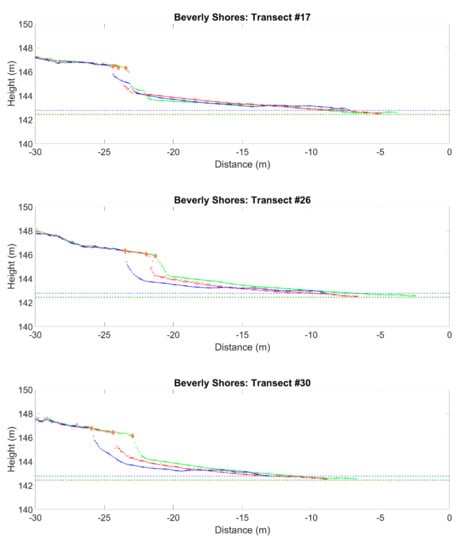 Cross-shore transects at Beverly Shores showing transect #17, transect #26, transect #30, and transect #34 (the IDs are corresponding to those shown in Figure 16).