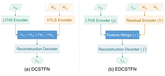 Comparison of general architecture between the deep convolutional spatiotemporal fusion network (DCSTFN) and enhanced deep convolutional spatiotemporal fusion network (EDCSTFN) model for Moderate Resolution Image Spectroradiometer (MODIS)-Landsat image fusion (the input of low temporal but high spatial resolution (LTHS) encoder is a Landsat image at reference time ; reference MODIS data at time and the MODIS data on prediction date share the same high temporal but low spatial resolution (HTLS) encoder for DCSTFN model. The inputs of residual encoder includes at least one pair of reference images at time and a MODIS image at time for prediction; and the output is a Landsat-like image on prediction date.