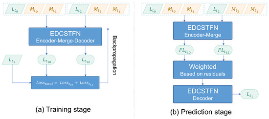 Specifically, there are four cases concerning the inputs of the model in training and prediction. When a training model with only one pair of references, the process is just the same as the DCSTFN. If two pairs of references are involved in training, the two references are still separated as two independent groups to be entered into the model. In other words, the model should satisfy the two different training data groups simultaneously, which can regularize the model in effect and prevent overfitting to a large extent, shown in Figure 3a. In this case, the EDCSTFN model updates the network learnable parameters with the backpropogation algorithm based on the sum total of losses from these two data groups. Owing to the independence of input data groups in model training, input group(s) with neither one or two reference(s) can be fed into the model in the prediction phase. If there is only one reference for prediction, then no extra process is needed and prediction results can be directly obtained from the trained network. If there are two references for prediction, the two intermediate feature maps from the feature merge layer, shown in Figure 1, need to be further weighted and then are entered into the reconstruction decoder to produce the final result, shown in Figure 3b. This also explains why residuals between reference and prediction are needed to be learned in the first place. The weighting method is built based on the inversion differences between reference and prediction, namely the output of residual encoder. It can be reasonably assumed that a larger distance represents a more significant ground change and the greater the change is, the less accurate the prediction becomes. Hence, by employing the inverse distance weighted method, both of the predictions can contribute to the final result based on their reliability. Equation (8) initially calculates weights regarding to the prediction with reference at time .